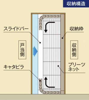 網戸を使わないときはスッキリ収納プリーツネットが折り畳まれて収納枠にスッキリ収まります。型崩れしにくいネットで、風による変形にも強い上下のキャタピラがスライドバーに入り込む構造です。