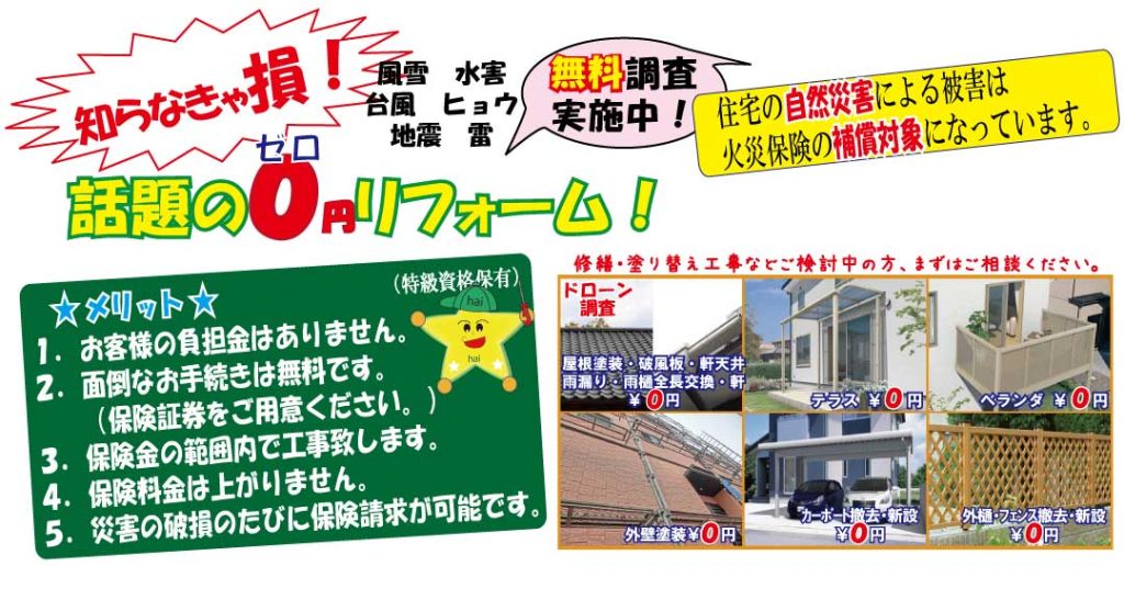 0円で雨トヨ修理が出来ます 2022年4月13日 最終更新日時 : 2022年7月22日 hakatakuaioihaihainet 自然災害による雨トヨ、外壁、屋根、ベランダ、カーポートなどの壊れは火災保険の補償対象です。保険金の範囲で工事出来ます。