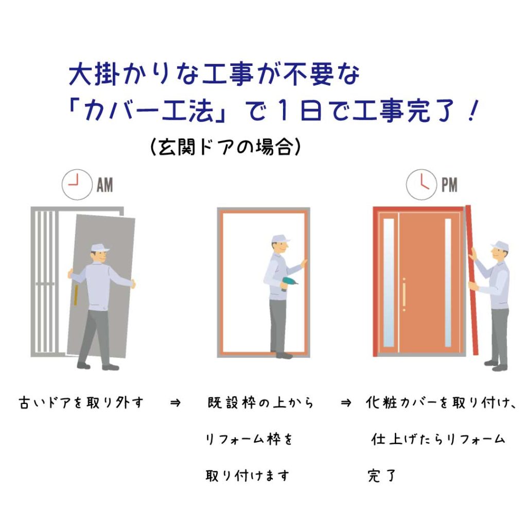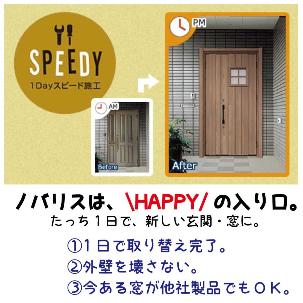 外壁を壊さずに工事が出来き、たったの1日で工事が完了します。今ついているドア、窓が他社の製品であっても大丈夫です。